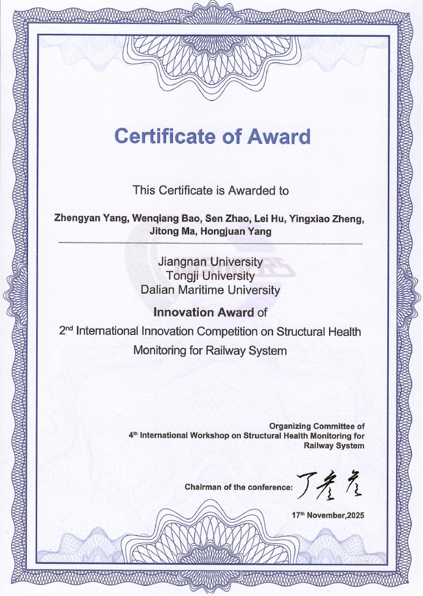 近日,第二届轨道交通结构健康监测国际创新大赛在新加坡金沙会议展览中心落幕,江南大学江阴霞客湾校区纤维工程与装备技术学院杨正岩教授牵头的参赛团队创新性融合导波信号处理技术与数据驱动建模方法,在“铝合金结构损伤诊断”赛道的激烈国际角逐中脱颖而出,荣获大赛“创新奖”。