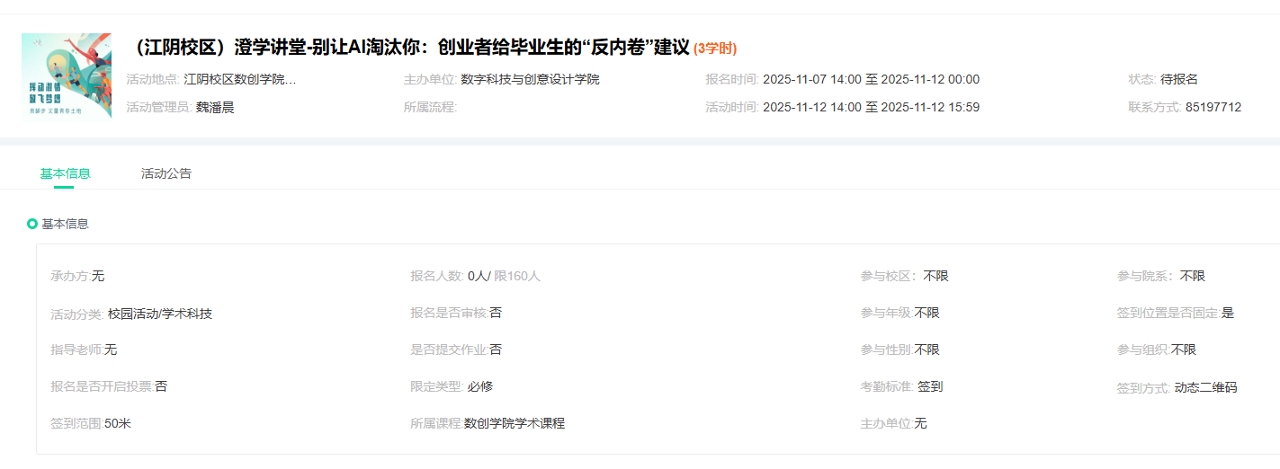 报名方式:此次讲座面向全校学生,可于11月7日14:00通过e江南第二课堂申请